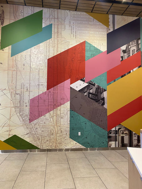 While working at Astek Wallcovering I was very fortunate to work on creating new murals for the interior of the New York New York in Las Vegas. I was tasked with creating a mural for the cafeteria that is located at the entrance of the Casino. The mural was based on geometric patterns and iconic New York City imagery. While working with the client I had the idea of bringing all the elements together by overlaying a map of Manhattan that flows with the shapes and images. This was a very rewarding piece that I handled from concept all the way through final print production.